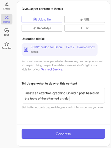 For repurposing articles into social media posts, it’s a helpful tool that takes a little more finessing than Jasper but can produce workable posts.